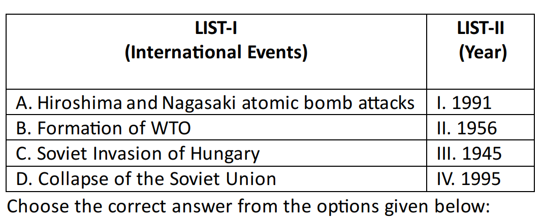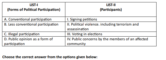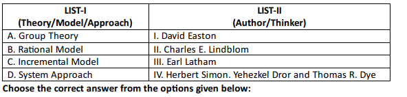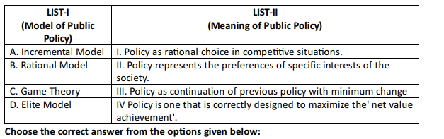 0% 6 Report a question What's wrong with this question? You cannot submit an empty report. Please add some details. 123456789101112131415161718192021222324252627282930313233343536373839404142434445464748495051525354555657585960616263646566676869707172737475 Created by Dr. S. H. Sarkar CUET PG 2025 1 / 75 1. Who was the founder of Bolshevik Communist party? 1. Vladimir Lenin 2. Joseph Stalin 3. Nikita Khrushchev 4. Leonid Brezhnev 2 / 75 2. What is the key guide to statecraft in the realist tradition? 1. National Interest 2. Universal brotherhood 3. Moral Principles 4. Cross-border flows and common values 3 / 75 3. Match the LIST-I with LIST-II 1. A-I, B-II, C-III, D-IV 2. A-III, B-IV, C-II, D-I 3. A-II, B-IV, C-III, D-I 4. A-III, B-IV, C-I, D-II 4 / 75 4. Chronologically arrange the events in the Cold War period. A. Berlin Wall is constructed B. Communist China joins the UN C. Soviet invasion of Czechoslovakia D. Berlin Blockade Choose the correct answer from the options given below: 1. A, B, C, D 2. D, A, C, B 3. B, A, D, C 4. C, B, D, A 5 / 75 5. Morgenthau's principles of political realism are: A. Politics is rooted in permanent and unchanging human nature which is basically self- centred, self-regarding and self-interested B. Politics is an autonomous sphere of action and cannot therefore be reduced to morals C. International Politics is an arena of conflicting self-interests D. The ethics of international relations is situational ethics which is very different from private morality Choose the correct answer from the options given below: 1. B, C and D only 2. A, B, C and D 3. A, B and C only 4. A, B and D only 6 / 75 6. Who among the following political thinkers consider the anarchical self- help system to be a compelling factor for States to maximise their relative power positions? 1. Hans J. Morgenthau 2. John Mearsheimer 3. Kenneth Waltz 4. Marysia Zalewski 7 / 75 7. Which among the following is not the principal aim of the UN as elaborated in its founding Charter? 1. To safeguard peace and security 2. Developing friendly relations among nations 3. To uphold respect for international law 4. To ensure economic development for minorities 8 / 75 8. Arrange the following events in a chronological order A. Korean War B. Vietnam War C. Non-Proliferation Treaty D. Strategic Arms Limitation Talks-I Choose the correct answer from the options given below: 1. A, B, C, D 2. A, D, C, B 3. A, C, B, D 4. B, A, C, D 9 / 75 9. In which year the Croatia became the 28th member of the European Union? 1. 2010 2. 2011 3. 2013 4.2014 10 / 75 10. Which term of nationalism was advocated by Giuseppe Mazzini? 1. Liberal Nationalism 2. Malignant Nationalism 3. Cosmopolitan Nationalism 4. Radical Nationalism 5. Both Liberal Nationalism and Cosmopolitan Nationalism 11 / 75 11. Knowledge without justice ought to be called cunning rather then wisdom, who said these words. 1. Locke 2. Cicero 3. Plato 4. Alice Stone 12 / 75 12. Which part of the Indian Constitution provides for the secular character of our polity? 1. Fundamental Duties 2. The Preamble 3. Directive Principles of state policy 4. Article 75 13 / 75 13. Which of the following is NOT an organ of the State as presented in the Saptanga Theory in Arthashastra? 1. Amatya 2. Durga 3. Shakti 4. Kosha 14 / 75 14. Who among the following political thinkers believed that Satya is the essence of Dharma? 1. Raja Rammohan Roy 2. V.D. Savarkar 3. M.K. Gandhi 4. B.R. Ambedkar 15 / 75 15. According to Rawls, the correct principles of Justice are determined by? 1. God 2. nature 3. the connections of society 4. the choice that rational individuals would make a hypothetical situation 16 / 75 16. What was the name of the organization founded by Vinayak Damodar Savarkar? 1. Mitra Mela 2. Shatru Mela 3. Aaptamitra Mela 4. Anushilan Samiti 17 / 75 17. Which among the following option is NOT a foreign policy alternative according to Kautilya in his Arthashastra? 1. Dvaidhibhava 2. Vigraha 3. Asana 4. Dana 18 / 75 18. Which among the following statements are CORRECT about Mahatma Gandhi's idea on Ahimsa? A. Mahatma Gandhi believed that satya led him to ahimsa. B. He distinguished between the positive and negative meanings of satya and ahimsa. C. Ahimsa was the manifest part of Truth. D. Ahimsa is the means and Truth is the end. Choose the correct answer from the options given below: 1. A, B and D only 2. A, B and C only 3. A, B, C and D 4. B, C and D only 19 / 75 19. First UN Secretary General Trygve Lie was associated with which country? 1. Austria 2. Sweden 3. Norway 4. Egypt 20 / 75 20. Which of the following statements are CORRECT about the single-transferable vote system? A. The single-transferable vote system was first proposed by Thomas Hare. B. It is widely used in the Republic of Ireland. C. In the States with multi-member constituencies, the representatives are elected from each constituency. D. The voters get to cast multiple votes. Choose the correct answer from the options given below: 1. A, B and D only 2. A, B and C only 3. A, B, C and D 4. B, C and D only 21 / 75 21. Amnesty International campaigns for the protection of the - 1. Infants 2. Senior Citizens 3. Environment 4. Human Right 22 / 75 22. According to Aristotle what was the perverted form of Aristocracy? 1. Tyranny 2. Democracy 3. Oligarchy 4. Monarchy 23 / 75 23. Which provision was inserted in the constitution by the 86th Constitution Amendment Act? 1. Article 19 2. Article 21 A 3. Article 51 A 4. Article 100 24 / 75 24. Who among the following political thinkers considered the state of nature as "war of every man against every man".? 1. Thomas Hobbes 2. John Locke 3. J. J. Rousseau 4. Machaivelli 25 / 75 25. Arrange in a chronological order Karl Marx's idea of historical stages of society? A. Primitive Communism B. Slave Society C. Feudalism D. Capitalism Choose the correct answer from the options given below: 1. B, C, D, A 2. A, C, B, D 3. A, C, D, B 4. A, B, C, D 26 / 75 26. Which of the following